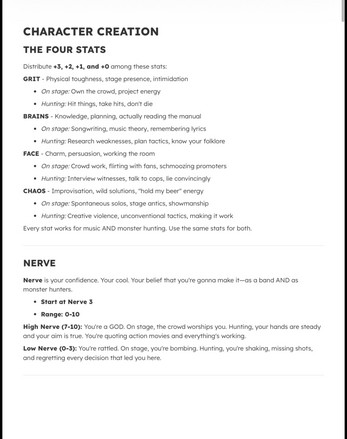- Character creation and band archetypes
