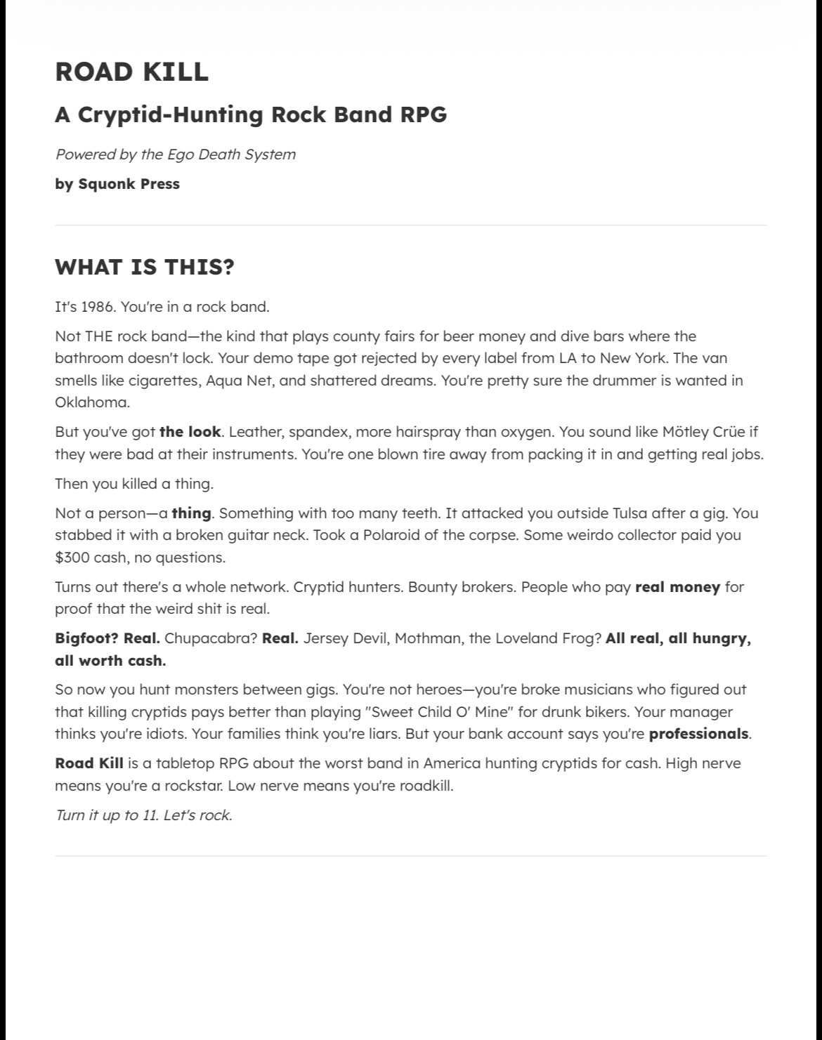Road Kill is a tabletop roleplaying game about the worst band in America surviving on the road by killing things that shouldn’t exist.
