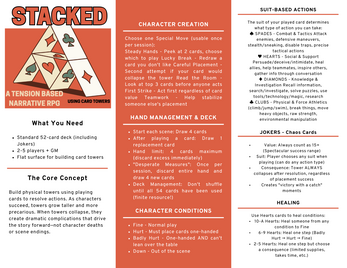 STACKED is a tabletop RPG that takes a different approach to physical tension mechanics. Instead of pulling blocks until everything collapses, you're building card towers that grow more precarious with every success.